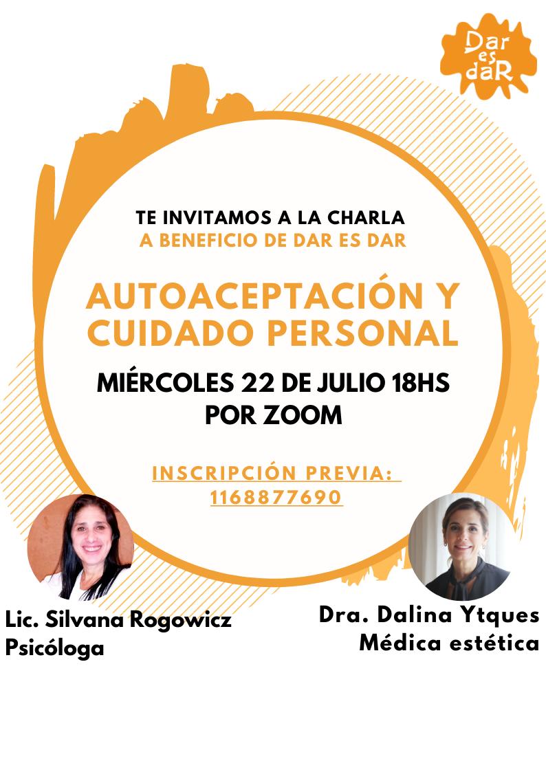 Charla “Auto aceptación y cuidados personal”  a beneficio de la fundación “Dar es dar “, junto a la lic. Silvana Rogowicz . Herramientas para trabajar la auto aceptación y el cuidado personal a través de hábitos saludables.